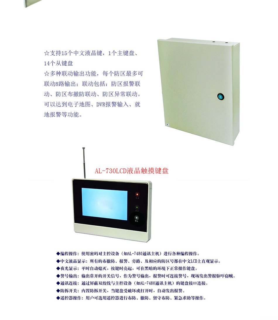 - 可最多接入8个键盘,独立操作,汉字界面。其中1个主键盘、7个从键盘,通过主键盘编程可以让任意键盘跟随所有报警并显示报警信息