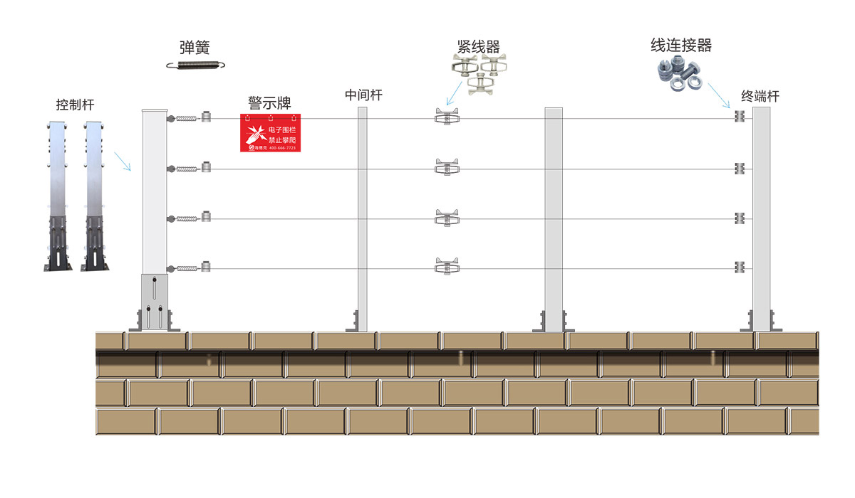 张力围栏加上传输线,报警信号传输控制设备,报警管理中心等设备即可构成一种新型周界防入侵报警系统。